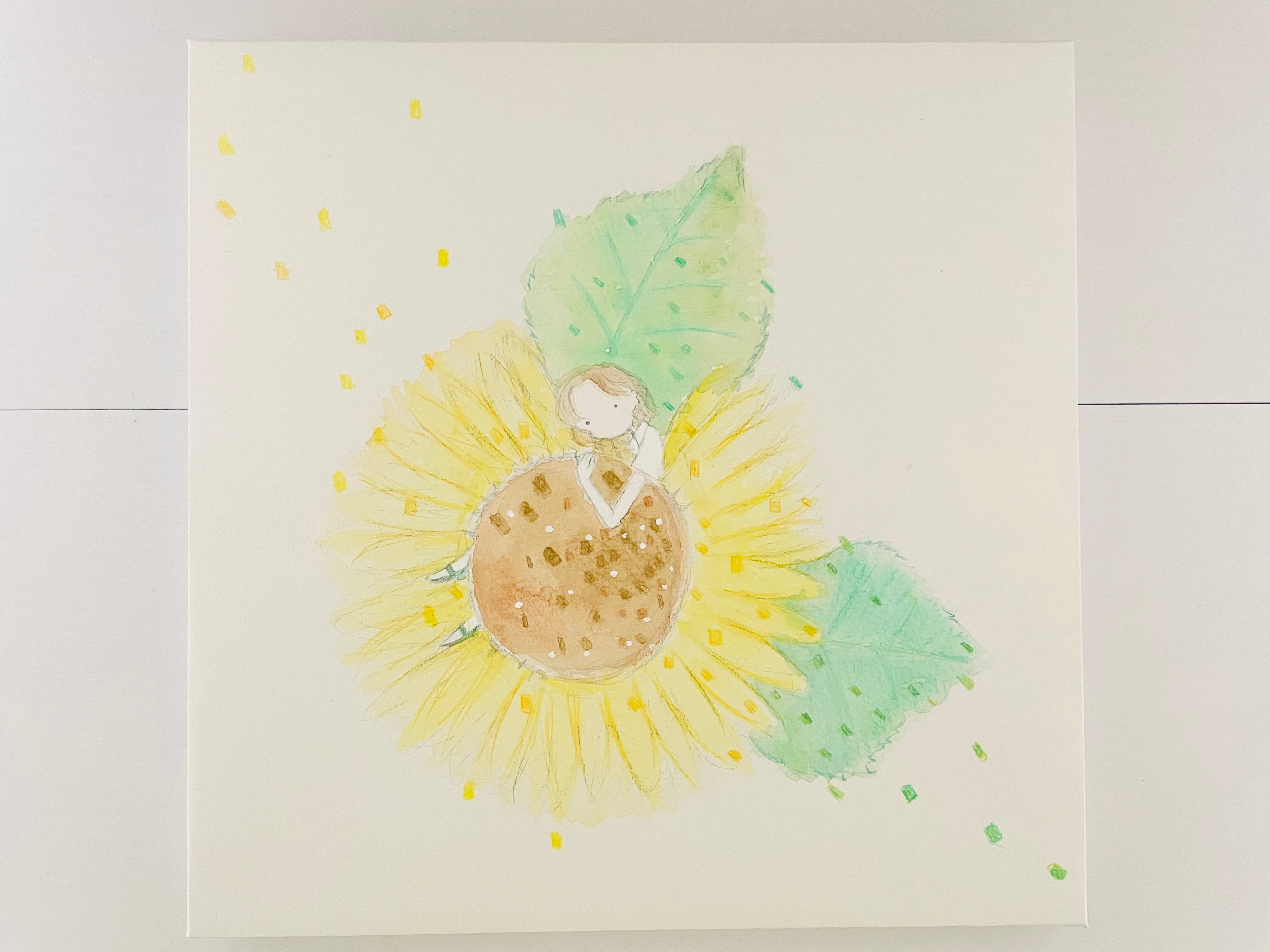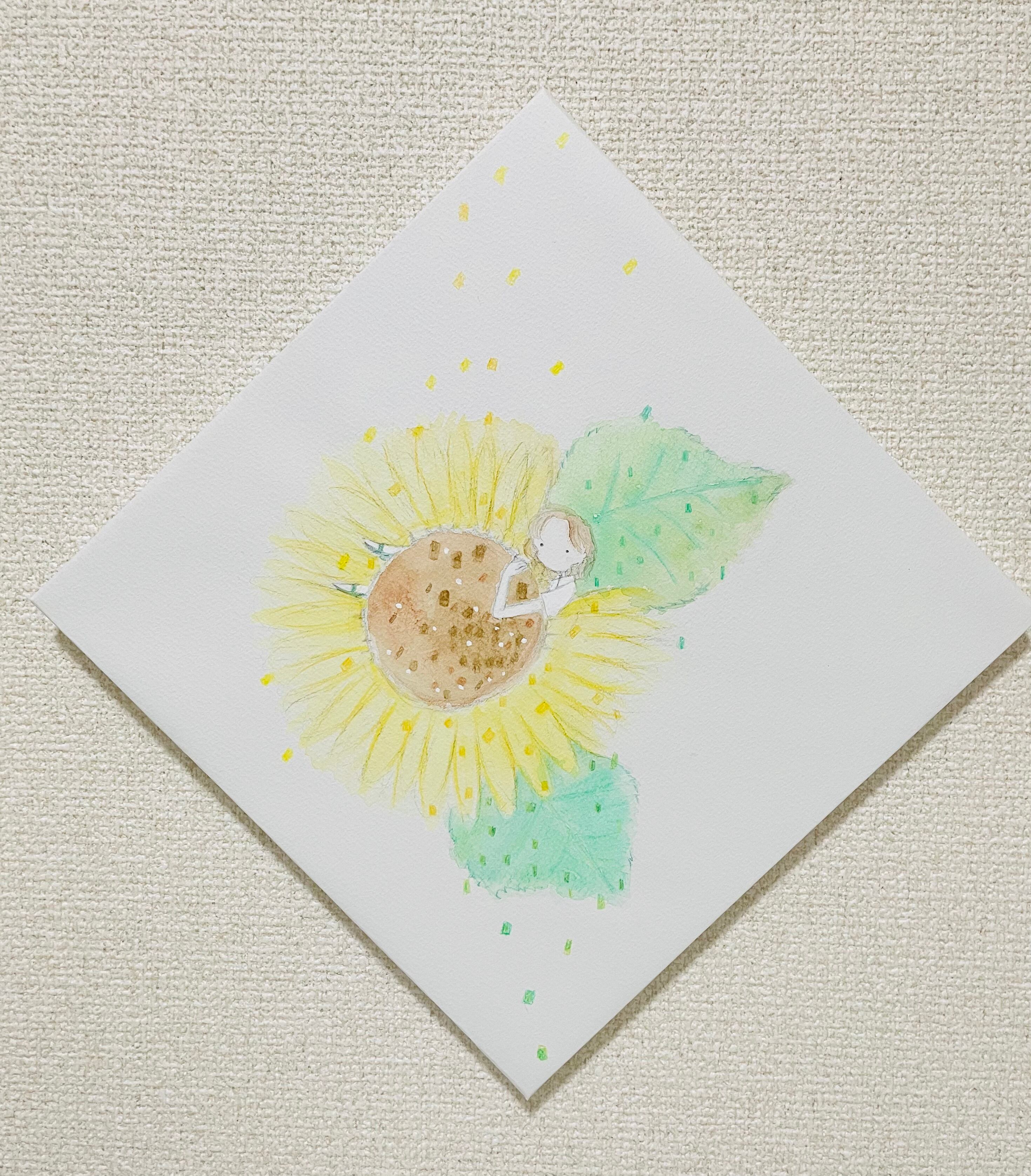 価格は送料込みです。 優しい印象のひまわりのイラストです。 正方形でも菱形でも可愛く飾れます。 木製パネル、画用紙、水彩色鉛筆 25cm×25cm×1.5cm 165g