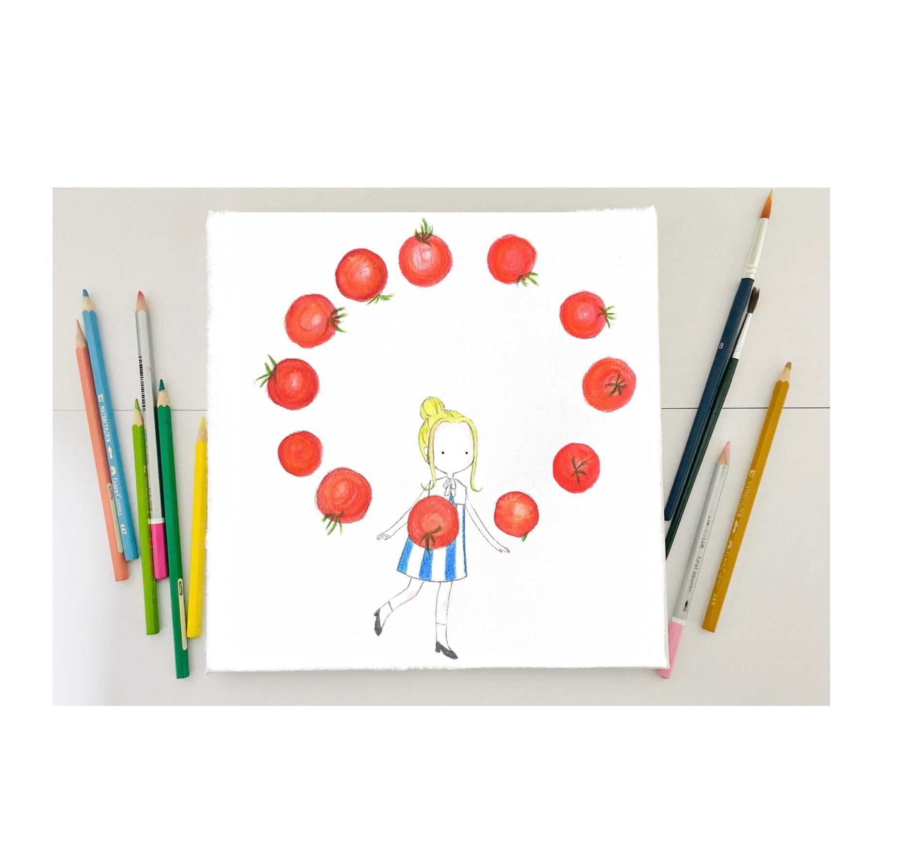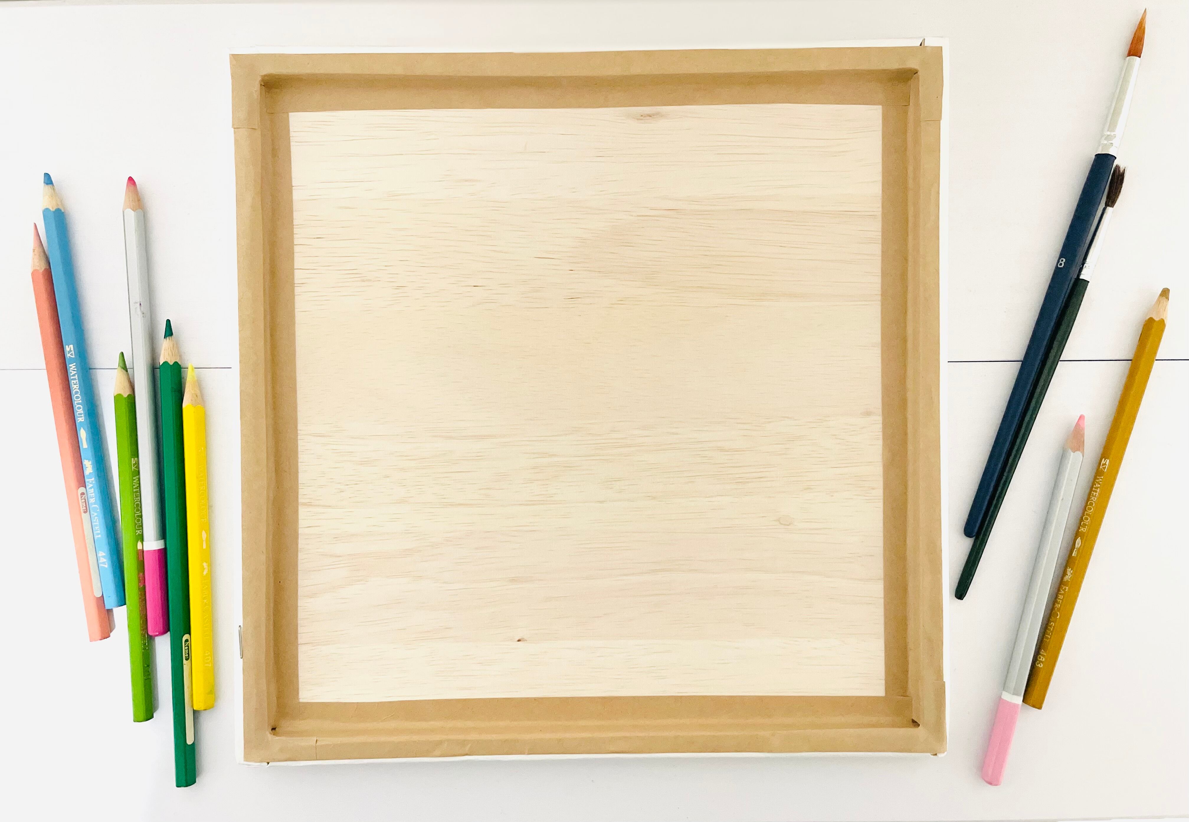 木製パネル、画用紙、水彩色鉛筆